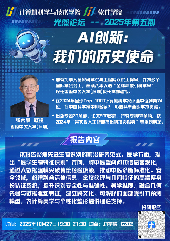 加拿大皇家科學(xué)院、加拿大工程院雙院士。IAPR/AAIA Fellow、IEEE Life Fellow。連續(xù)八年被評選為全球高被引科學(xué)家,在國際計算機2024年Top 1000名計算機科學(xué)家評選中,以D-Index=130排名74,中國第7?,F(xiàn)任香港中文大學(xué)(深圳)數(shù)據(jù)科學(xué)學(xué)院和人工智能學(xué)院雙聘校長學(xué)勤教授,廣東省體表泛化感知與模式分析工程技術(shù)研究中心主任、深圳市模式分析與感知計算重點實驗室主任。從事人工智能和生物識別相關(guān)研究40余年。已出版20余部學(xué)術(shù)專著、500余篇高水平論文和60余項美國/日本/中國專利。張大鵬教授是掌紋識別、中醫(yī)四診量化及人臉美學(xué)客觀化等研究領(lǐng)域的開創(chuàng)者和領(lǐng)軍人,曾獲2024年度吳文俊人工智能杰出科技貢獻獎、我國香港特區(qū)的最高科技獎 “裘槎優(yōu)秀科研者”等。